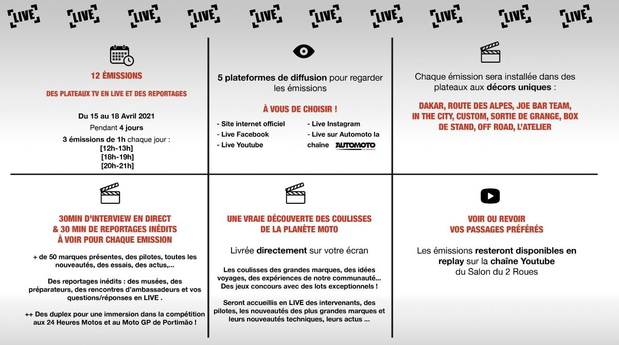 Le salon proposera ainsi 12 émissions en live de 1 h, réparties sur 4 jours, sur la chaîne partenaire Automoto, Facebook, Youtube, 21Instagram et sur le site officiel du salon.