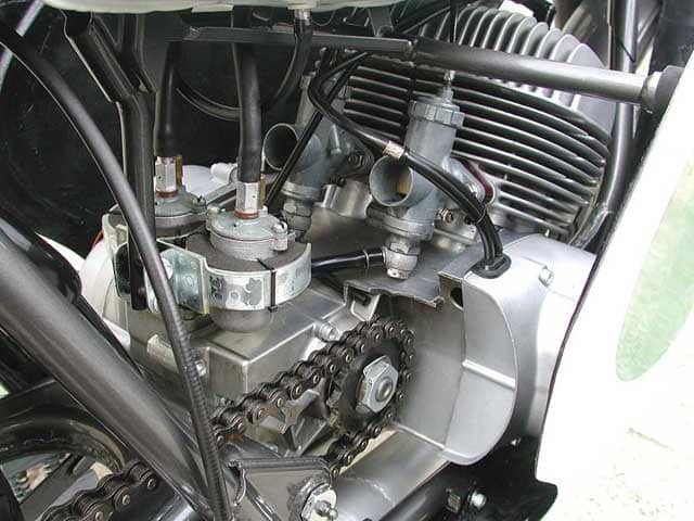 Bicylindre deux-temps refroidi par air. Carburateurs à cuves séparées.