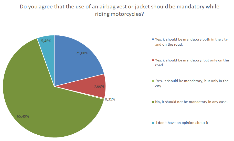 En général, les motards espagnols qui ont participé à l’enquête estiment qu’il est intéressant de porter des vêtements équipés d’airbags, mais ils sont contre le caractère obligatoire de cela. Les raisons sont les frais à engager et l’absence TVA réduite sur ces équipements de sécurité.