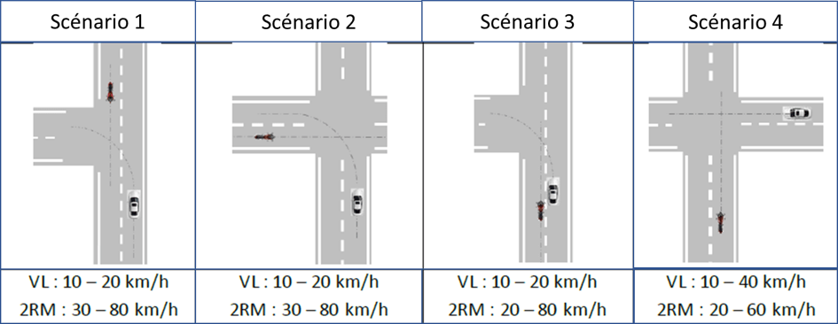 Quatre scénarios d’accidents types ont été définis. Parmi eux, la voiture qui tourne à gauche et coupe la route au motard arrivant en sens inverse ou encore le non-respect de la priorité à droite à un carrefour, ont ainsi permis de tester l’efficacité de la communication V2X sur le centre d’essai de Linas-Montlhéry.