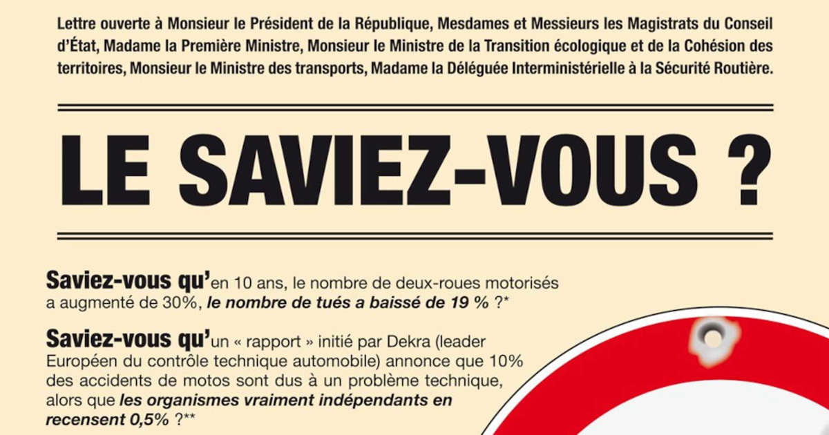 Cette lettre ouverte est à l’initiative d’un professionnel de la moto – un expert en communication à l’origine de nombreux visuels publicitaires qui ont été unanimement reconnus – Les propos tenus dans cette lettre ouverte lui ont valu d’être co-signée par la Fédération Française des Motards en Colère, la Fédération Française de Motocyclisme, le Codever.