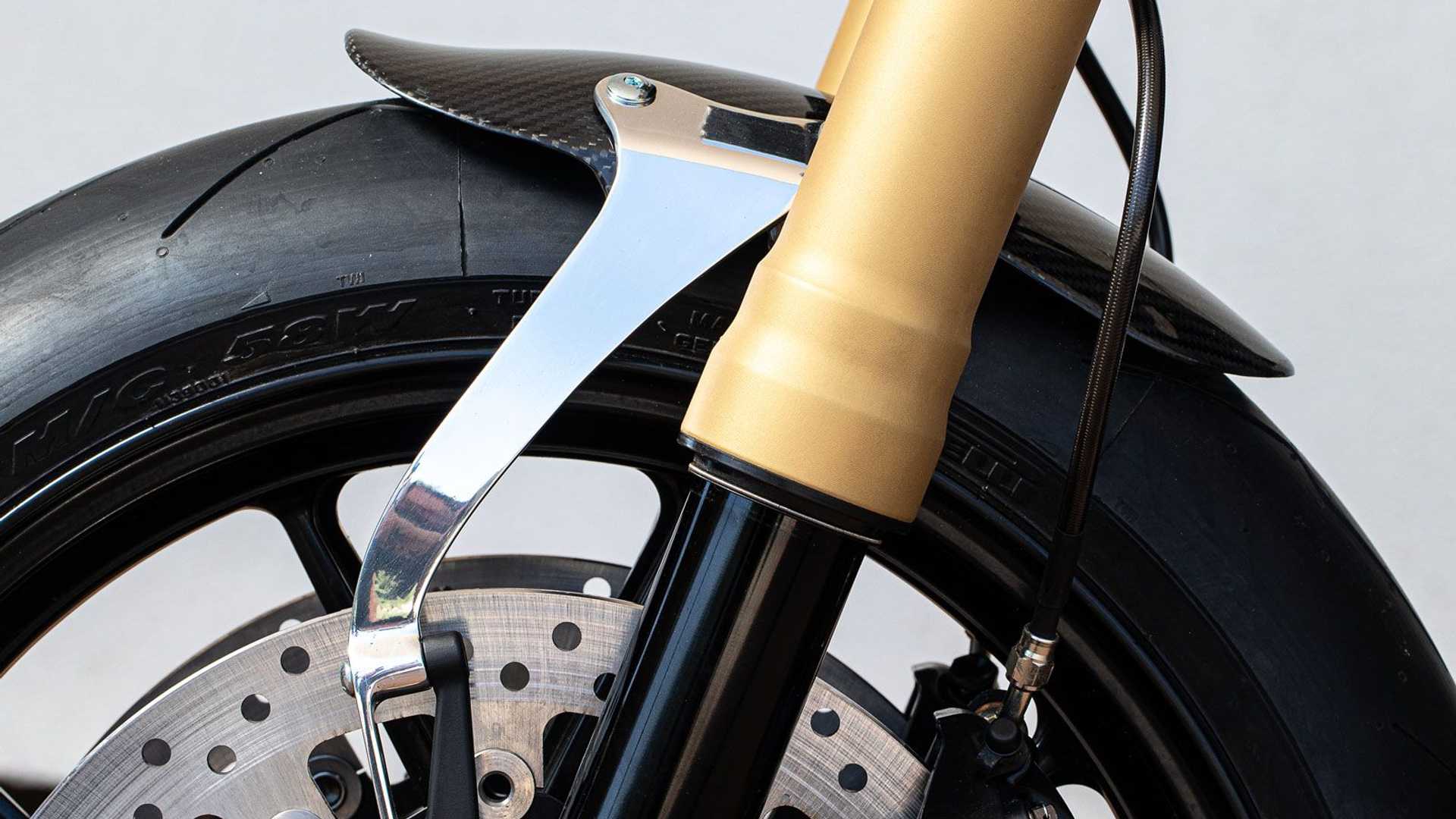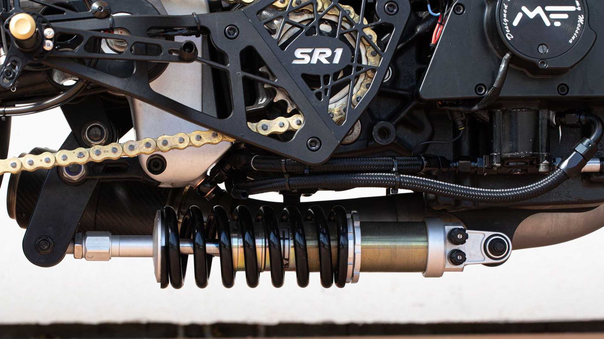 Des éléments tels que les roues Marchesini de 17 pouces, les tés de fourches usinés CNC et le monobras oscillant en alliage permettent de perdre des kilos supplémentaires, mais le SR1 ne se contente pas de réduire la graisse, il gagne également du muscle. Sous forme d’origine, le moteur Buell développait 101 ch. Jimmy Messina le booste avec deux carburateurs Keihin FCR de 39 mm, des filtres à haut débit et un échappement SC-Project 2 en 1 personnalisé pour un peu plus de punch.