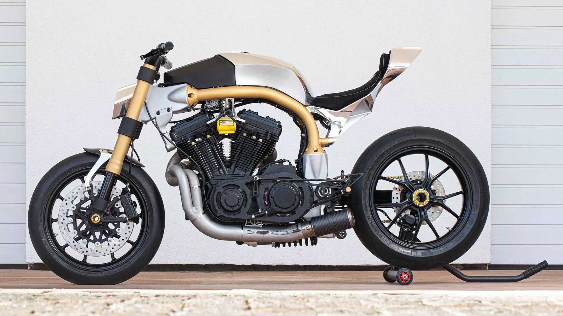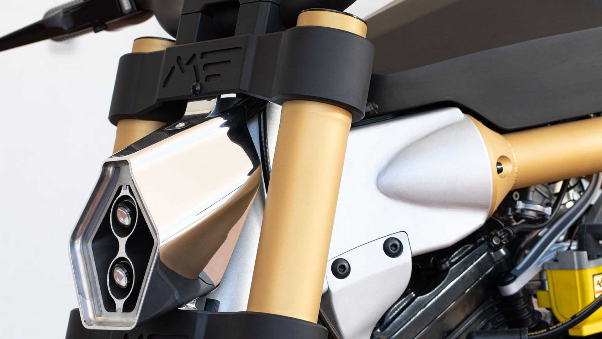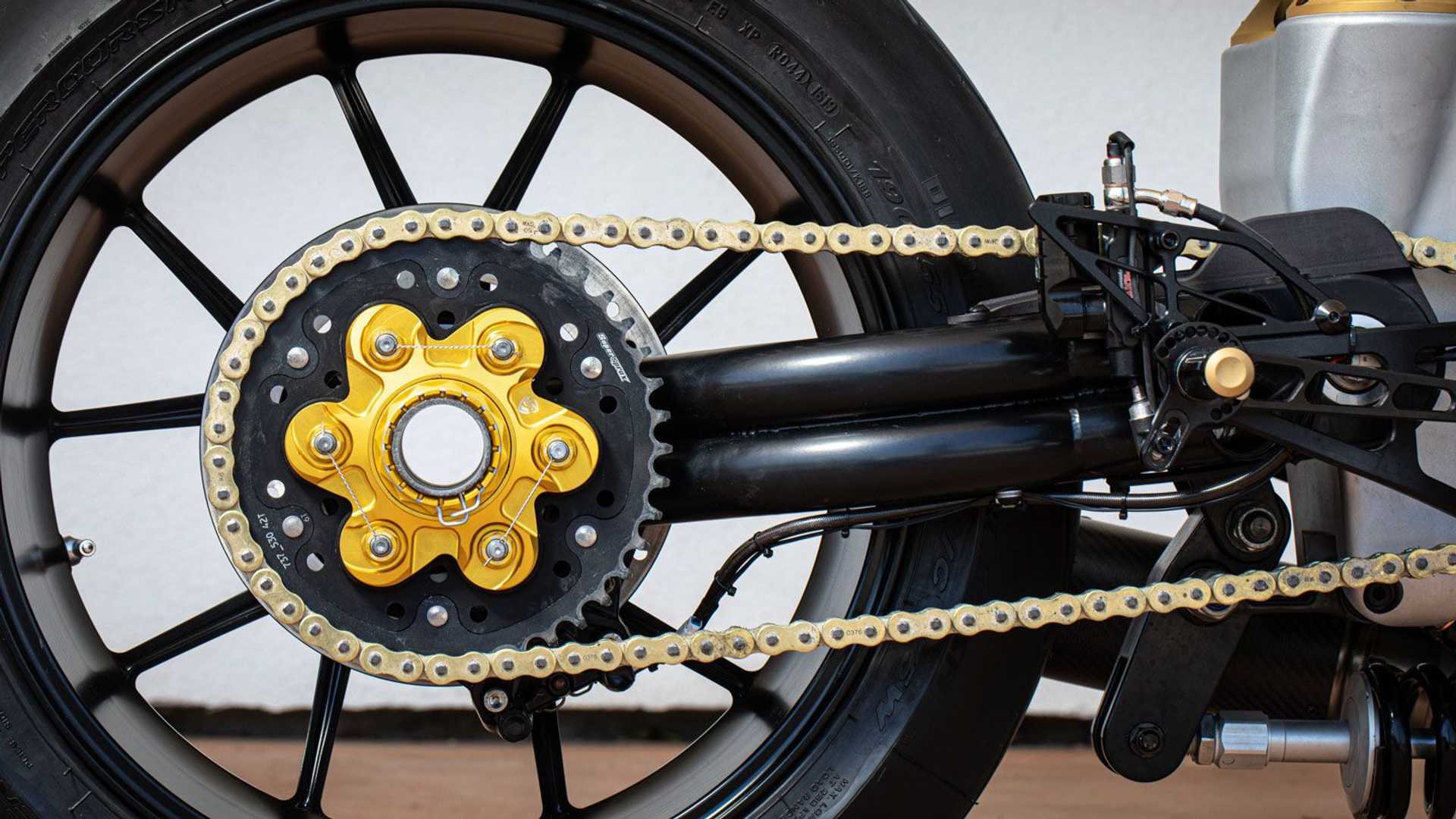 Construit en aluminium de qualité aéronautique, le cadre se compose d’une double colonne vertébrale tubulaire 7075 accouplée aux « blocs » avant et arrière. Le cadre léger augmente à la fois les économies de poids et la rigidité en adaptant le bicylindre en V de 1 203 cc en tant qu’élément sollicité. Une fourche et un système de freinage empruntés à une Ducati 1198 renforcent l’avant, tandis que les spécialistes français de la suspension EMC ont les ont aidés à réaliser leur propre conception d’amortisseur inversé.