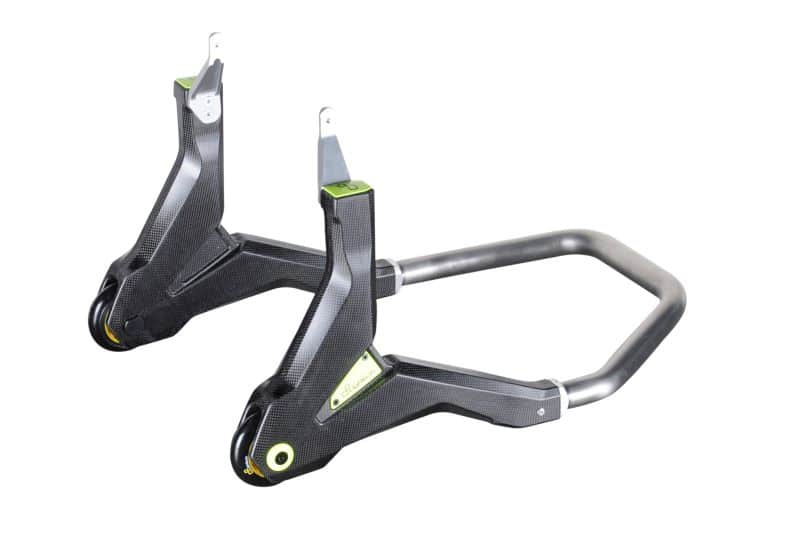 Confinée à l’atelier, votre moto est bien éloignée des paddocks. Lightech lui offre des airs de MotoGP et de WSBK avec une nouvelle béquille arrière réalisée en deux pièces de fibre de carbone, chacune recevant une roue (grand diamètre: 100 mm) montée sur roulement à bille. Notons que ces dernières réalisées en Nylon sont dotées de rayons de grande qualité afin de supporter les charges les plus lourdes.