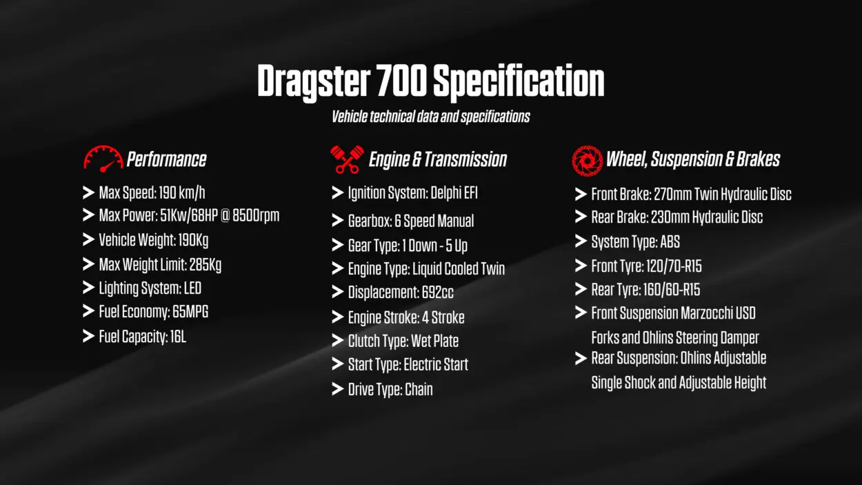 Le Dragster 700 Twin équipée d’un boîte à 6 rapports sera officiellement présenté à l’EICMA 2024 (7-10 novembre) et sera disponible sur le marché à partir du printemps-été 2025. Il y aura également la version exclusive Limited Factory Edition, à seulement 700 exemplaires dans le monde. Les précommandes ont ouvert le 12 juillet, jour où le design attractif de ce modèle exclusif a été dévoilé. La version standard coûtera en effet environ 12 900 euros, un coût qui s’élève à 14 900 euros pour la Limited Factory Edition qui comprendra la livrée noire et or ainsi que les éléments Öhlins, Brembo et Akrapovic que l’on peut déjà apercevoir…