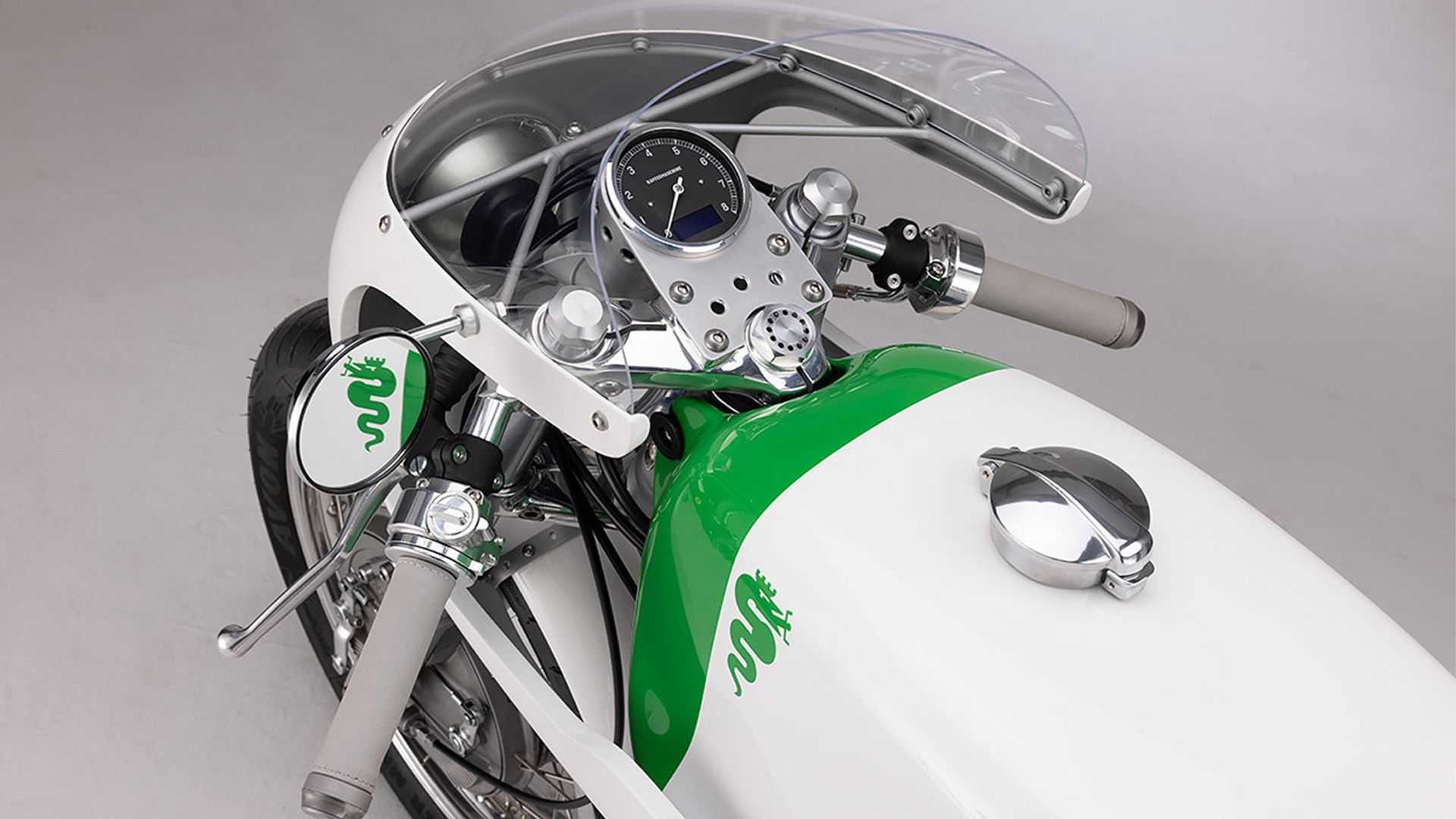 Dirigée par Axel Budde, l’équipe a transformé une Moto Guzzi SP1000 de 1981 à l’image de la Giulia GTA 1300 Stradale d’Alfa Romeo. Adoptant la peinture et les finitions chromées Biancospino emblématiques de l’équipementier automobile, le tourer trouve une nouvelle vie en tant qu’élégant café racer.