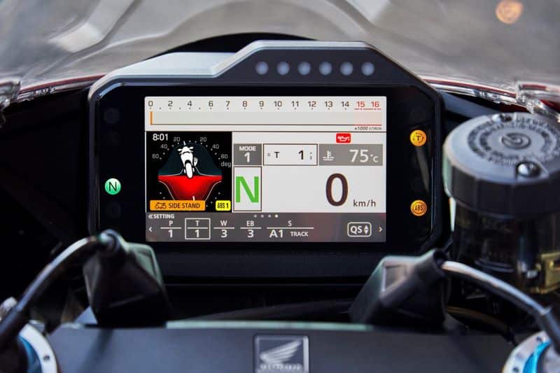 Propulsée par un quatre cylindre en ligne de 999,7 cm3 aux côtes fondamentales supercarrées identiques à la RC213V, la triple R c’est 160 kW à 14 500 tr/ min soit un peu plus de 217 chevaux, des bielles et chapeaux en titane, des pieds de bielle en cuivre au berylium, des pistons refroidis par jets d’huile, une distribution à linguet par cascade de pignons… mais aussi un système de commande de gaz électronique TBW optimisé pour gagner en réactivité et en feeling couplé à un panel électronique de dernière génération orienté autour d’une centrale inertielle Bosch IMU à 6 axes. On retiendra notamment 3 modes de conduite prédéfinis, chacun d’entre eux pouvant être personnalisé en termes de puissance et de comportement. Une puissance pouvant être paramétrée sur 5 niveaux, le frein moteur et anti-wheeling sur 3 niveaux de réglages, le HSTC (système de contrôle de couple) sur 9 réglages… bref une usine à gaz dernière génération qui n’oublie pas l’ABS en courbe (également paramétrable… cela va sans dire) vient assister les disques, plus gros que par le passé, pincés par de nouveaux étriers radiaux 4 pistons Brembo Stylema .