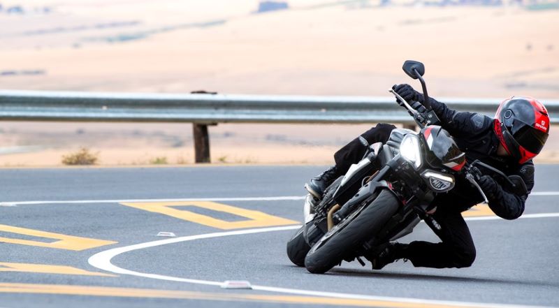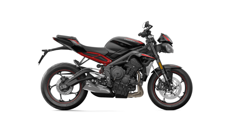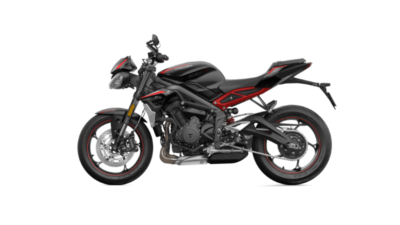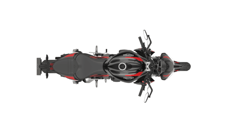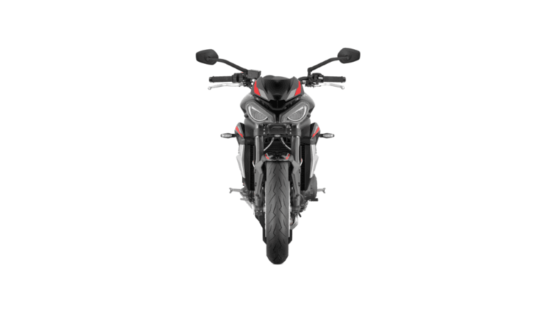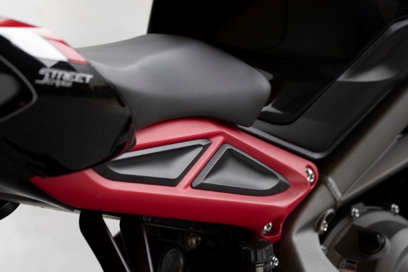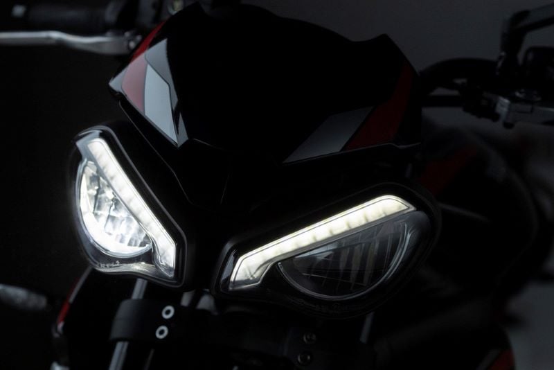 Du côté des équipements, Triumph fait confiance à Brembo qui signe le freinage avec, à l’avant, des étriers radiaux 4 pistons de type M4.32 venant pincer des disques de 310 mm (220 mm pour l’arrière avec étrier simple piston), Showa a la charge de la fourche (inversée SF-BPF de 41 mm) et de l’amortisseur arrière, tous deux entièrement réglables. Les Pirelli Diablo Rosso III seront choisis en première monte. Notons la présence, de série, d’un shifter up&down, de trois modes de conduite (road, rain et sport, le mode rain limitant la puissance à 100 ch), de l’ABS, de l’anti-patinage…