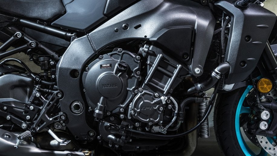 Cette évolution de la MT-10 dispose d’une version épurée du légendaire moteur Crossplane CP4 à refroidissement liquide, étroitement liée à la mythique R1. Développant plus de puissance et de couple, ce moteur est le plus impressionnant et le plus avancé technologiquement jamais vu sur une Yamaha Hyper Naked. Cette motorisation actualisée pour 2022 intègre des pistons forgés en aluminium léger, de bielles décalées et des cylindres traités afin d’assurer une efficacité maximale. Elle dispose d’un certain nombre de nouvelles caractéristiques spécifiques qui améliorent la sensation de couple. Pour booster les performances à mi-régimes, des bielles en acier sont préférées aux éléments en titane qui équipent la R1, et le moment d’inertie du vilebrequin est augmenté.