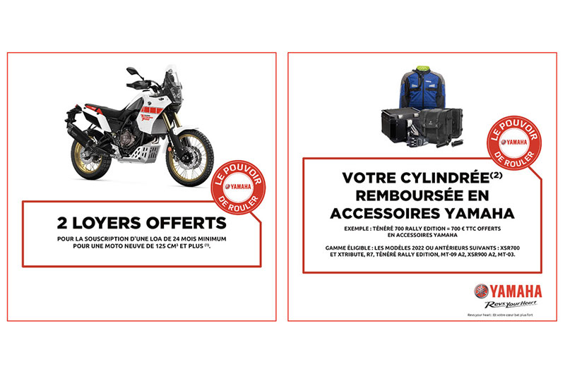 – VOTRE CYLINDREE OFFERTE EN ACCESSOIRES (2) à valoir dans les gammes accessoires et vestimentaires Yamaha dans la limite des stocks disponibles. Gamme éligible : millésimes 2022 ou antérieurs, pour les modèles XSR700, XSR700 XTribute, R7, Ténéré Rally Edition, MT-09 A2, XSR900 A2, MT-03.