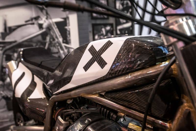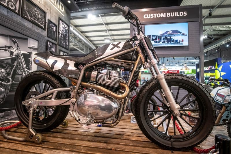 Propulsé par un bicylindre de 650 cm3, ce prototype a été pensé pour les courses de Flat Track. Cadre tubulaire en acier brossé spécifique pour l’exercice, jantes RSD chaussées en Dunlop, échappement sur-mesure signé S&S, la moto se la joue old school mais se veut résolument moderne. Un soin tout particulier a été apporté à l’assemblage ainsi qu’aux éléments de carrosserie faisant la part belle à la fibre de carbone.