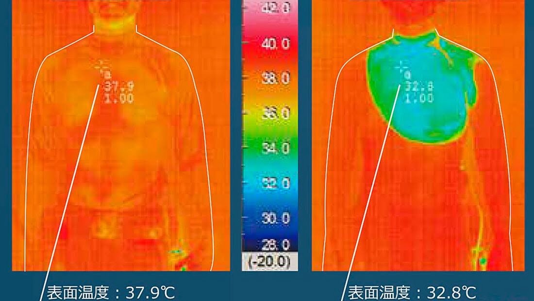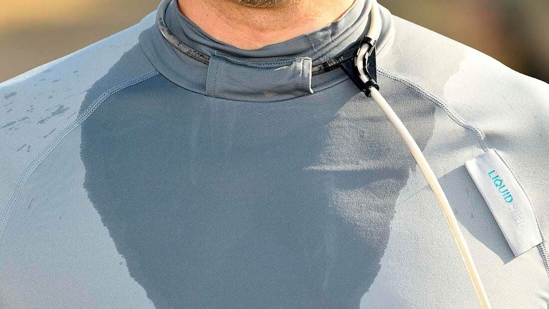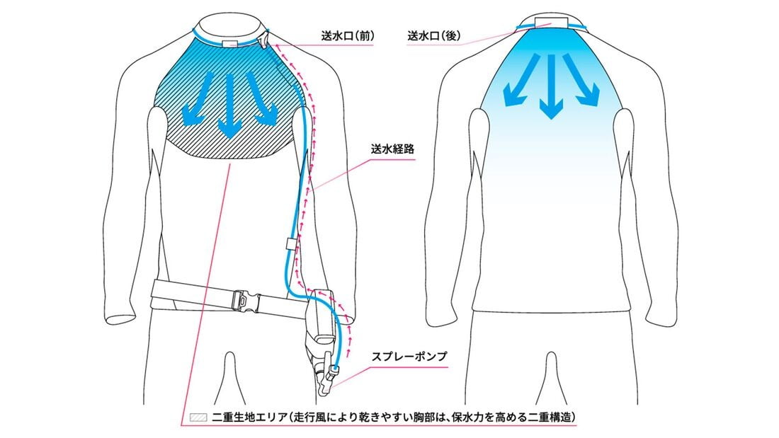 Le mécanisme est simple : un vaporisateur est attaché à une ceinture autour de la taille. De ce flacon pulvérisateur, un tuyau monte le haut du corps et s’enroule autour du cou. Dans la zone du cou, le tuyau a des orifices de sorte que l’eau s’échappe lorsque le vaporisateur est utilisé et est distribuée de haut en bas au niveau de la poitrine et dans le dos, sur un t-shirt spécialement développé.