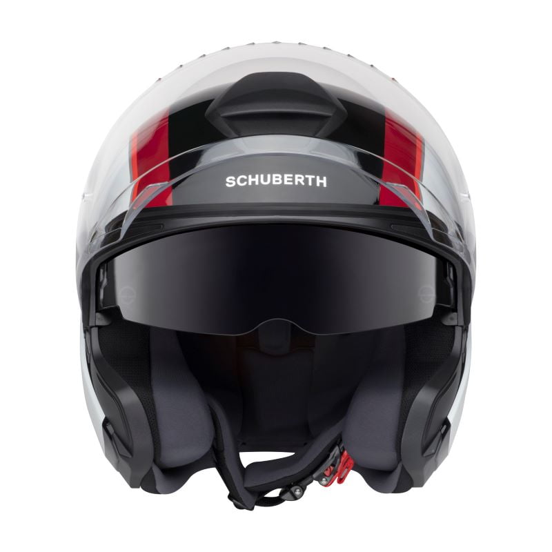 Haut de gamme le jet en fibre de verre et composite se pare d’un écran couvrant permettant d’augmenter son champ d’action. Ce dernier peut être remplacé par une petite visière livrée de série. Double écran solaire, intérieur amovible (réalisé dans une seule et même pièce pour gagner en confort), boucle de jugulaire micrométrique… bref du haut de gamme capable de rivaliser avec du Shoei ou Arai…