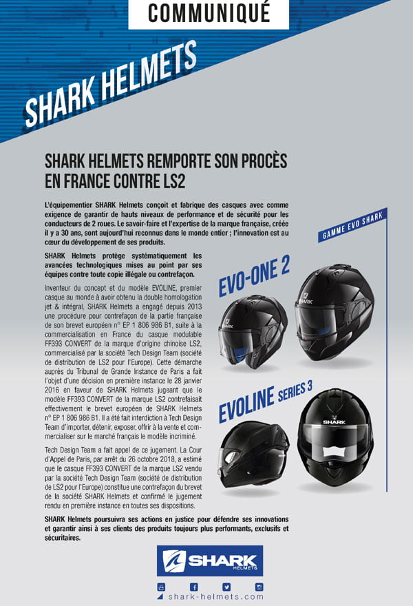 Cette démarche auprès du Tribunal de Grande Instance de Paris a fait l’objet d’une décision en première instance le 28 janvier 2016 en faveur de SHARK Helmets jugeant que le modèle FF393 CONVERT de la marque LS2 contrefaisait effectivement le brevet européen de SHARK Helmets n° EP 1 806 986 B1. Il a été fait interdiction à Tech Design Team d’importer, détenir, exposer, offrir à la vente et commercialiser sur le marché français le modèle incriminé.