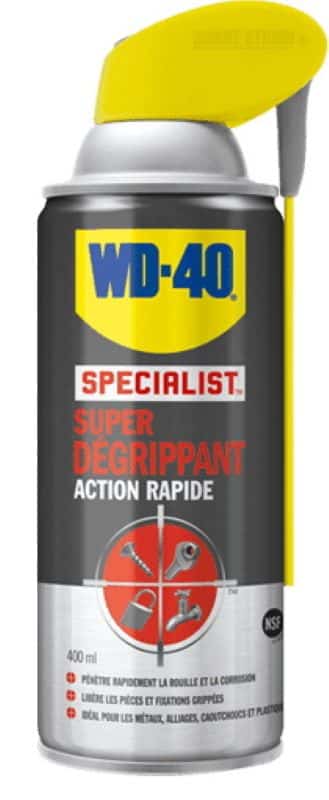 Bloqué, coincé… Impossible à desserrer ? Une vis, un écrou, un axe, un boulon, vous donnent du fil à retordre ? Le Super Dégrippant WD-40 devrait répondre à vos besoins. Rapidement et en une application, la solution libère les fixations grippées et les pièces mobiles bloquées ou prises en masse par la rouille. Vis de disque de frein bloquée, écrou d’axe de roue grippé, câble antivol, bloque-disque coincé, tout y passe avec une formule chimique compatible avec tous les métaux, alliages, caoutchoucs et sur la plupart des peintures. Résistant à l’eau, il affronte des températures de -20°C à +90°C.