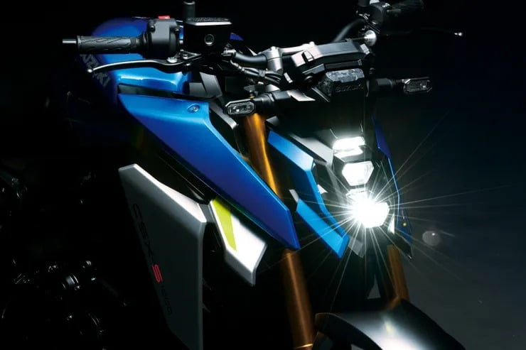 Les carénages s’étendent vers l’avant depuis les côtés du nouveau réservoir de carburant, avec des enveloppes de radiateur en dessous et, bien sûr, des ailerons de chaque côté. Ils attirent le regard sur un petit saute vent, avec un phare à LED futuriste. Selon Suzuki, ces nouveaux feux hexagonaux affichent une lumière plus large et plus brillante.