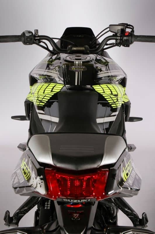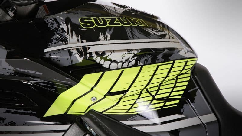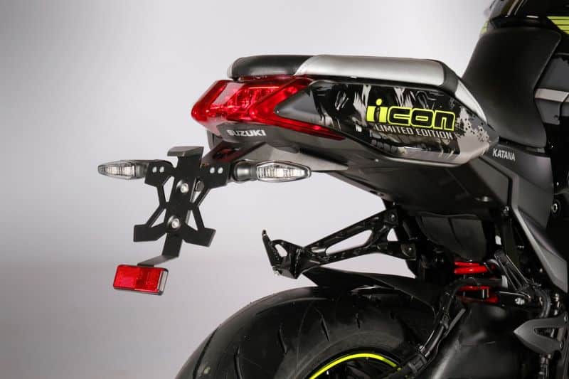 Outre le jaune fluo et autres impressions grises, cette Katana reçoit comme accessoires de rigueur un silencieux signé Akrapovič, des patins de protection sans oublier un support de plaque en aluminium, le tout estampillé de l’incontournable plaque numérotée faisant foi de son authenticité.