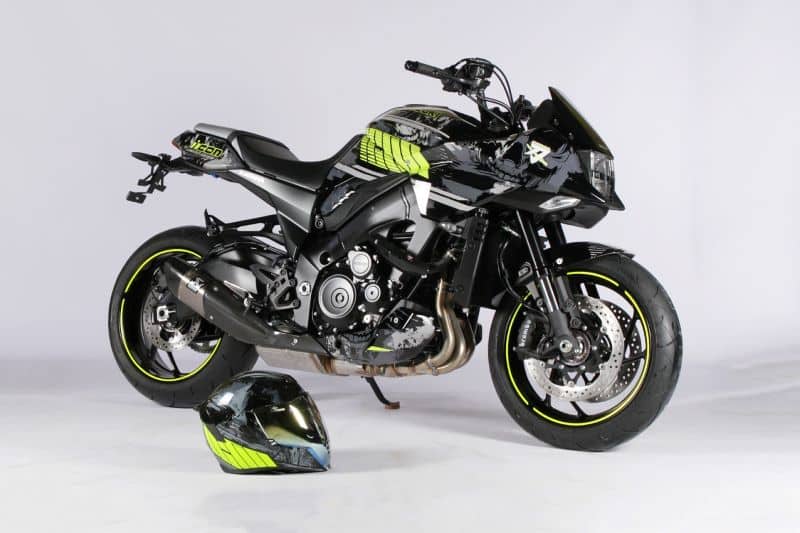Outre le jaune fluo et autres impressions grises, cette Katana reçoit comme accessoires de rigueur un silencieux signé Akrapovič, des patins de protection sans oublier un support de plaque en aluminium, le tout estampillé de l’incontournable plaque numérotée faisant foi de son authenticité.