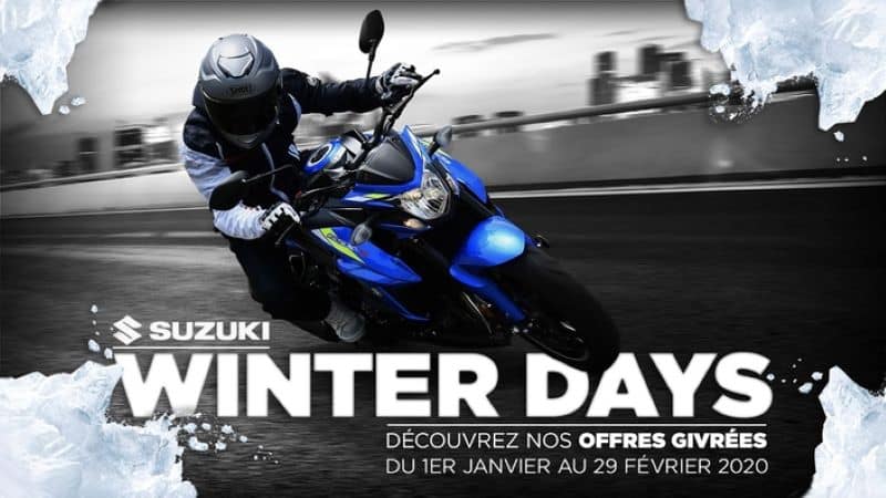 Les Winter Days se sont de nombreuses promos allant de la GSX-R 125 à la GSX-R 1000R dont cette dernière recevra 1 400 balles d’aide à la reprise pour l’achat d’un millésime 2018. Maxi-scooters, roadsters et même cross seront touchés par cette déferlante de fraicheur qui fera du bien à votre compte en banque. Suzuki glace les prix jusqu’au 29 février prochain… des ristournes qui réchauffent…