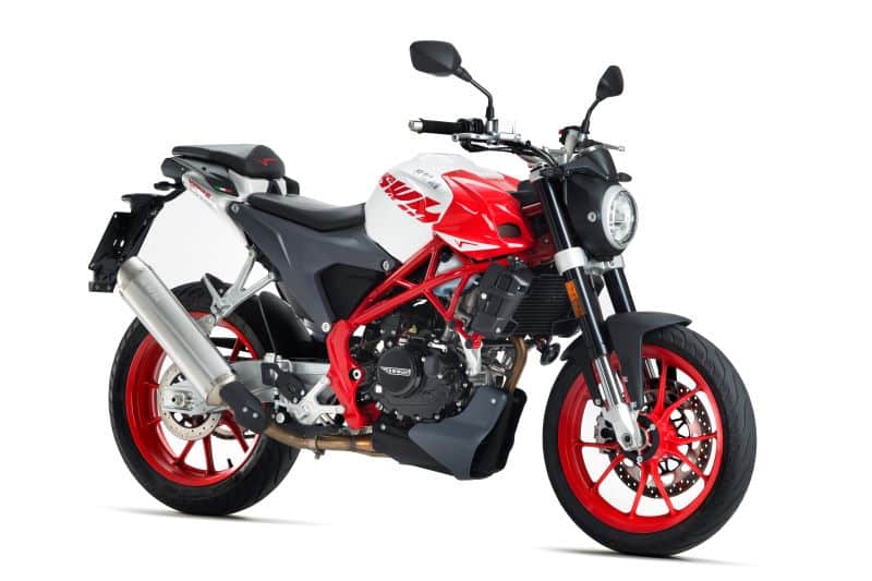 Avec son monocylindre 4 Temps à refroidissement liquide (norme Euro4) issu de ses cousines Outlaw et Ace of Spade, la nouvelle 125 signée SWM promet une puissance maximale de 15 chevaux à 10 500 tr/ minute. Belle prestation ! La marque italienne soigne sa copie avec une centralisation du poids sous le réservoir où l’on retrouve batterie et moteur. Cahier des charges qualitatif pour le roadster qui a droit à des équipements qui n’ont rien à envier à la concurrence à l’image du tableau de bord multifonction, du guidon en aluminium, des feux (avant et arrière) et clignotants à LEDs, d’une injection Athena, d’une fourche inversée Fast Ace (41 mm) réglable en détente et compression, d’un mono-amortisseur réglable en pré-charge et détente et de jantes en aluminium chaussées de pneumatiques Michelin Pilot Street.