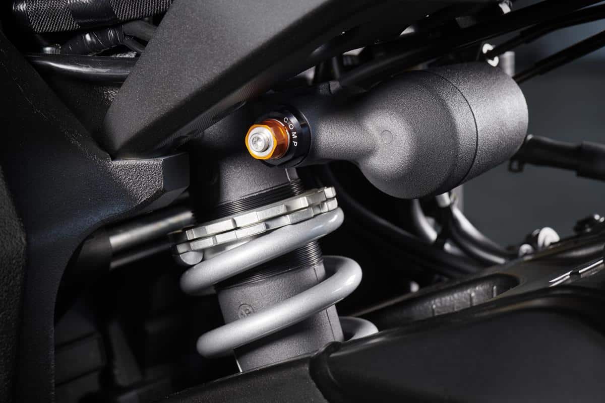 Le modèle 2020 adopte la fourche à gaz Öhlins ERS NPX. À l’intérieur de l’axe de fourche se situe un cylindre contenant du gaz. En exerçant une pression interne de 0,6 MPa, le gaz réduit la cavitation de l’huile de fourche causée par la pression négative qui se produit sur la course de détente. La nouvelle fourche à gaz Öhlins ERS NPX contribue de manière significative à un amortissement plus constant pour un contrôle du châssis plus élevé, ainsi qu’à une plus grande agilité pour des chronos au tour réduits. La suspension arrière électronique Öhlins bénéficie quant à elle d’un réglage de précharge modifié.