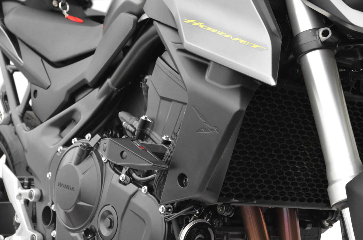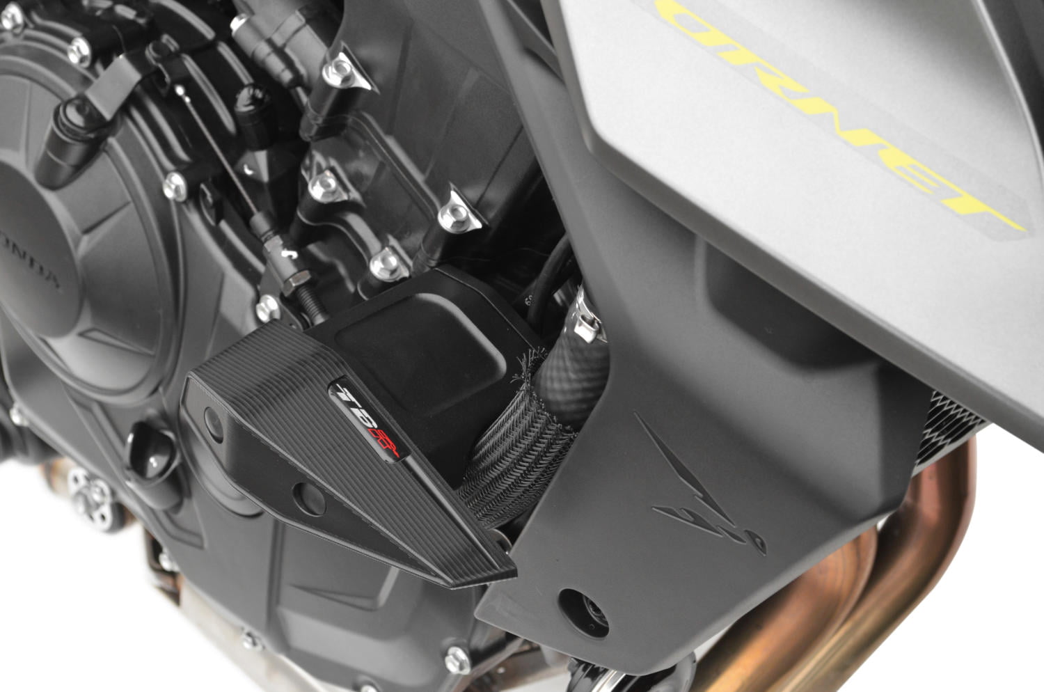 Au registre des éléments de protection proposés pour la nouvelle Hornet on retrouve des crash-pads quasi indispensables dès lors que l’on roule sur route en roadster pour sécuriser le moteur et le cadre. Ces deux patins et leurs platines respectives composent le kit Top Block qui a bénéficié d’une conception devant répondre à un cahier des charges stricte pour délivrer précision lors du montage, mais aussi résistance en cas de nécessité. Les patins sont usinés à partir d’un bloc d’ertacétal, un matériau composite de type polyacetal copolymère plébiscité pour sa haute résistance mécanique, sa rigidité et sa dureté. Il présente également l’avantage d’apporter une grande résistance aux chocs et à l’usure tout en favorisant la glisse. Le design des patins est épuré avec un profilé aérodynamique. De couleur noir l’ensemble platine-patin s’intègre parfaitement sans surcharger la ligne de la Hornet tout en apportant une protection efficace.