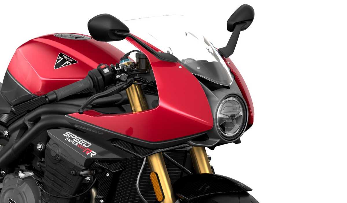 Ce nouveau modèle sera disponible en deux coloris : Red Hopper et Storm Grey, ou Crystal White et Storm Grey avec des détails dorés. Les deux options sont livrées en standard avec la quille et le capot de siège peints pour correspondre à chaque palette de couleurs, ainsi que le siège passager facilement interchangeable. Le ticket d’entrée pour la nouvelle Speed Triple 1200 RR en France sera de 20 490 euros.