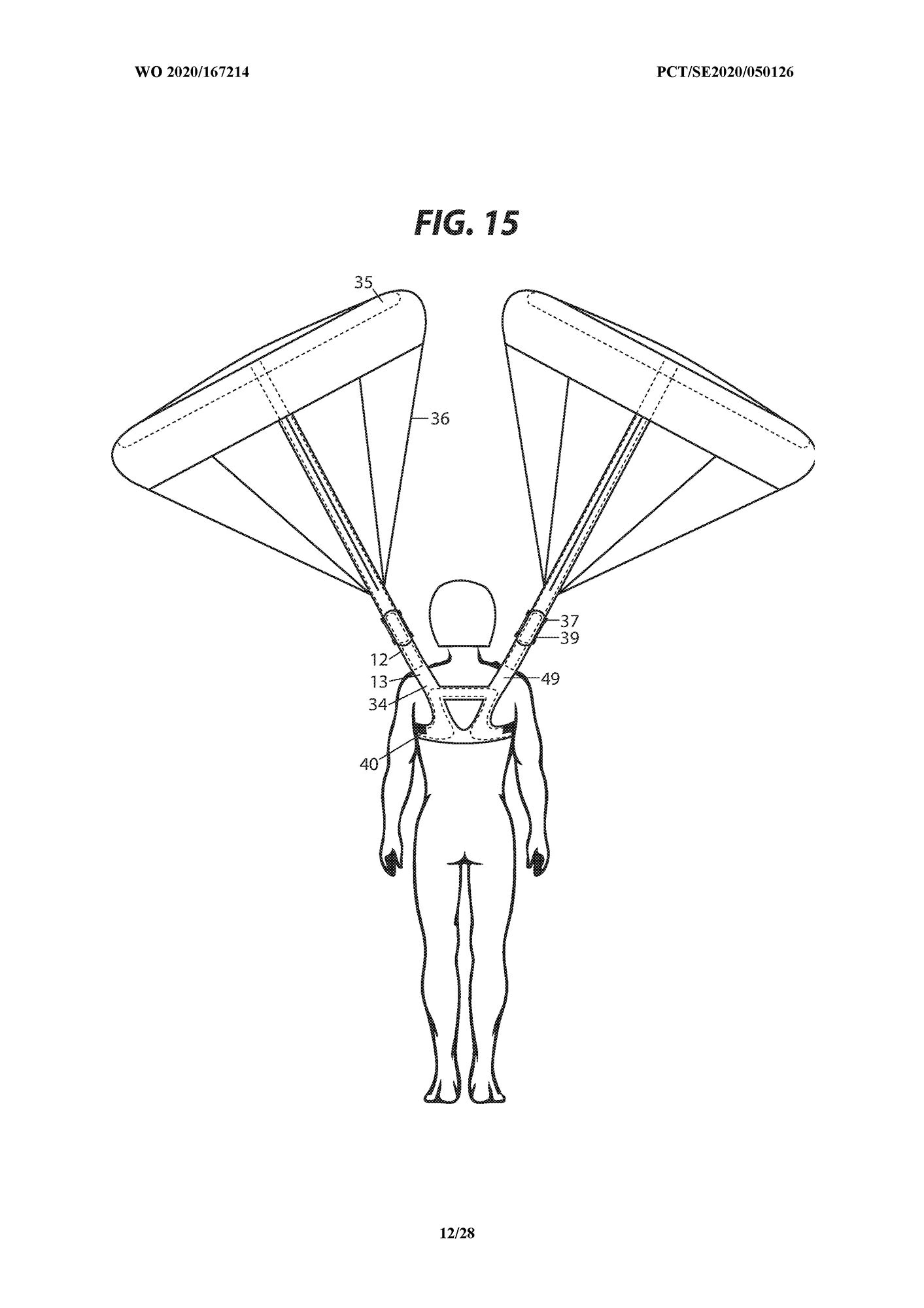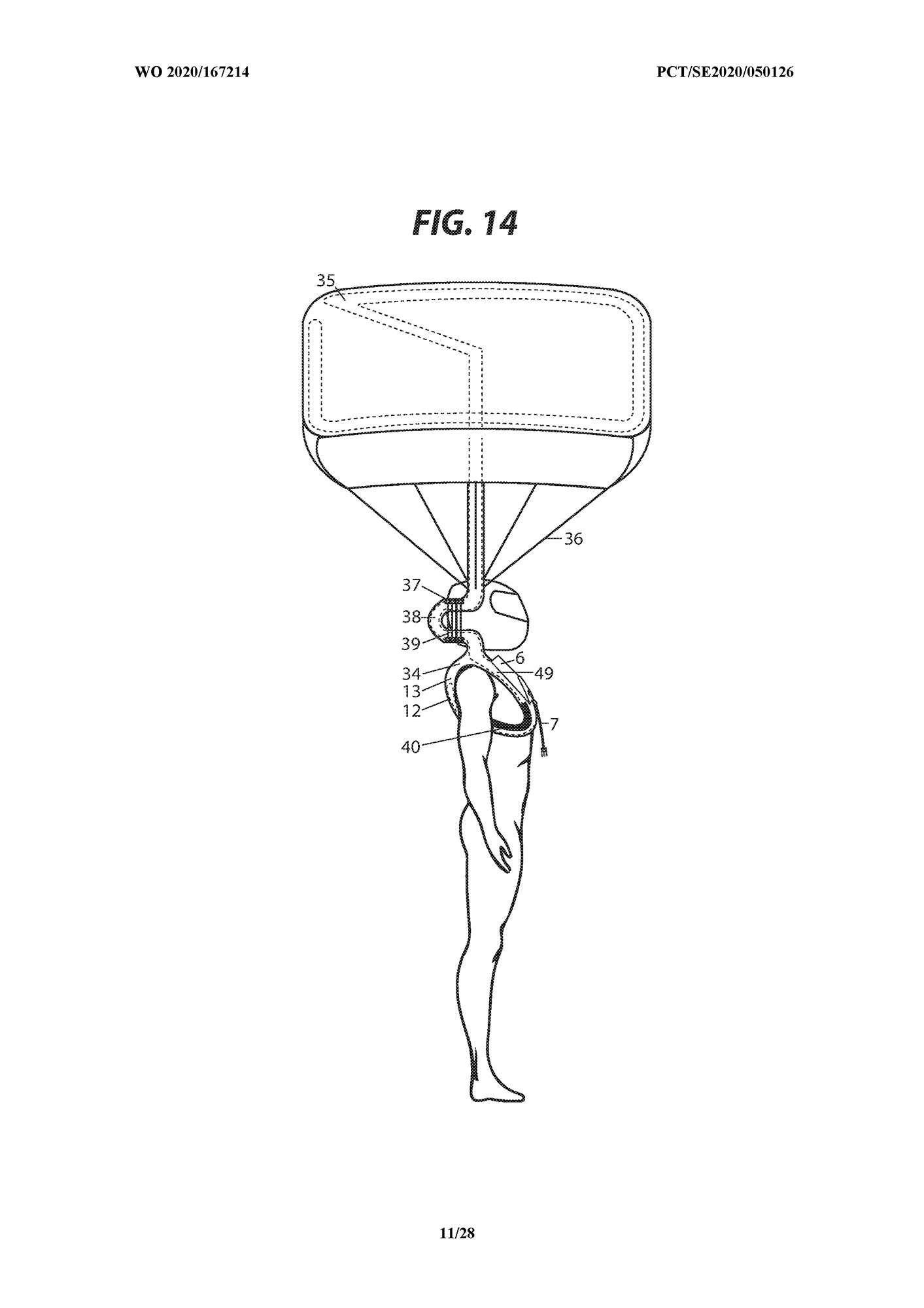 Cela peut sembler étrange au premier abord, mais c’est là que l’idée d’Airbag Inside entre en jeu, et a fait l’objet d’une réflexion approfondie appliquée à la théorie. Le concept consiste à utiliser deux petites voilures, semblables à des piscines gonflables pour enfants, le bord gonflable prenant forme immédiatement, sans avoir besoin du passage d’un flux d’air. De même, les principaux « cordons » (ou points d’attache) aux voilures sont gonflés pour devenir relativement fermes et les positionner au-dessus de la tête du motard. Les seules lignes réelles sont des cordes stabilisatrices pour empêcher les auvents de tourner et/ou de perdre l’air qu’ils attrapent. Ils sont attachés à des points au-dessus de la tête du motard pour les éloigner de son cou et réduire les risques d’emmêlement. Le système est gonflé à l’aide de la technologie conventionnelle de gonflage des airbags, qui peut être pyrotechnique ou via des cartouches de gaz comprimé.