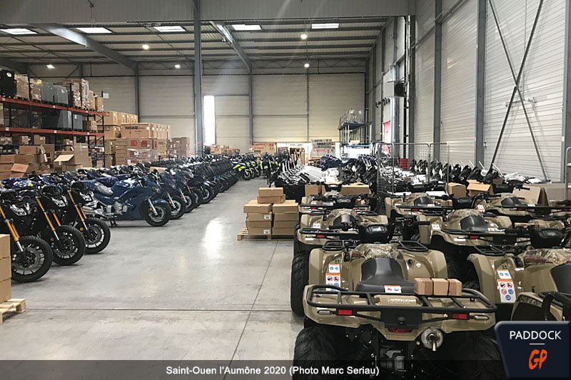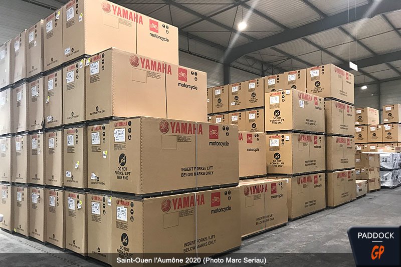 Une image qui, pour des raisons écologique, tend à disparaître. Dorénavant, les motos arrivent généralement dans des racks métalliques qui sont réutilisés afin d’éviter l’utilisation du carton. Là, il s’agit d’un vieux stock…