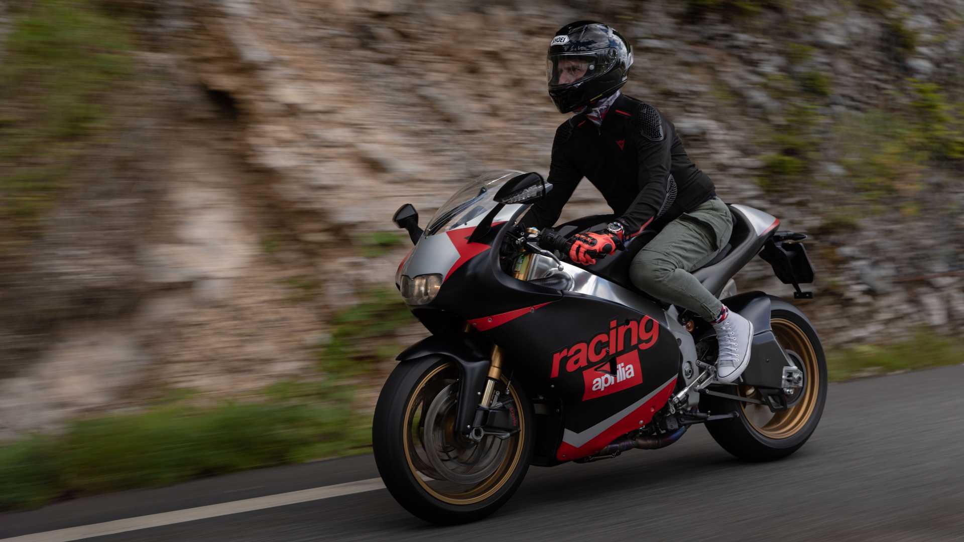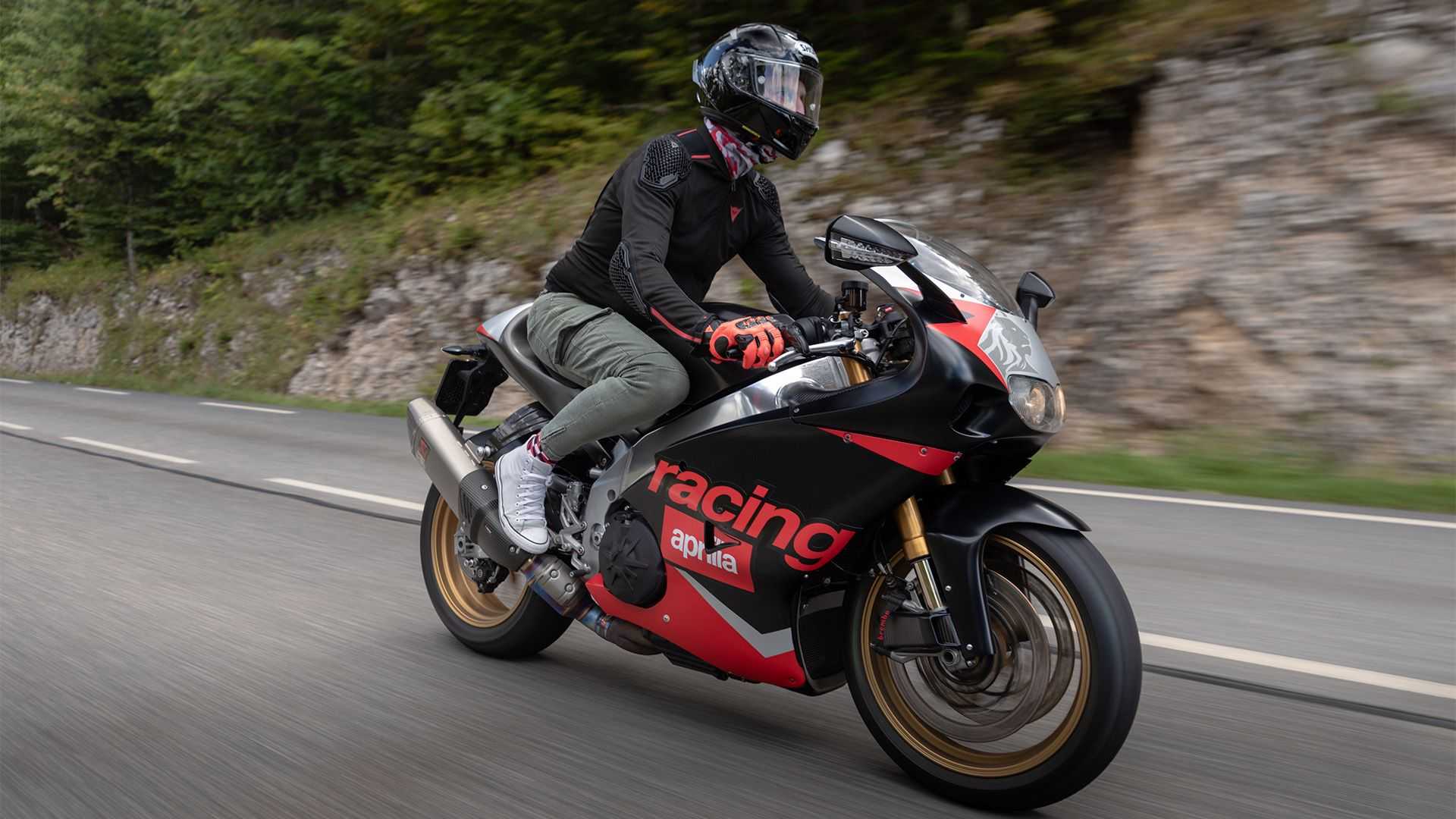 Aprilia a produit la RS250 entre 1995 et 2002. Créée comme une ode au succès de la catégorie intermédiaire en Grand Prix de l’usine de Noale, elle s’est avérée être l’un des derniers deux temps homologués pour la route. Alors que la RS250 et la RSV4 ont arboré des traitements graphiques et des coloris similaires au fil des ans, les deux modèles ne pourraient pas être plus différents.