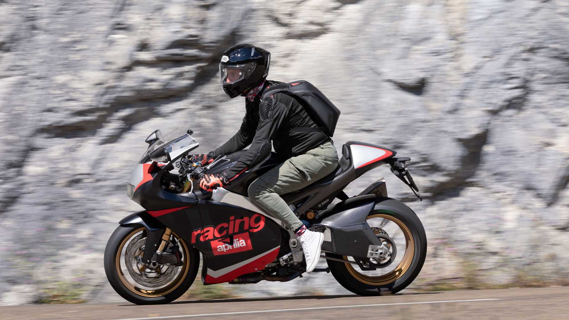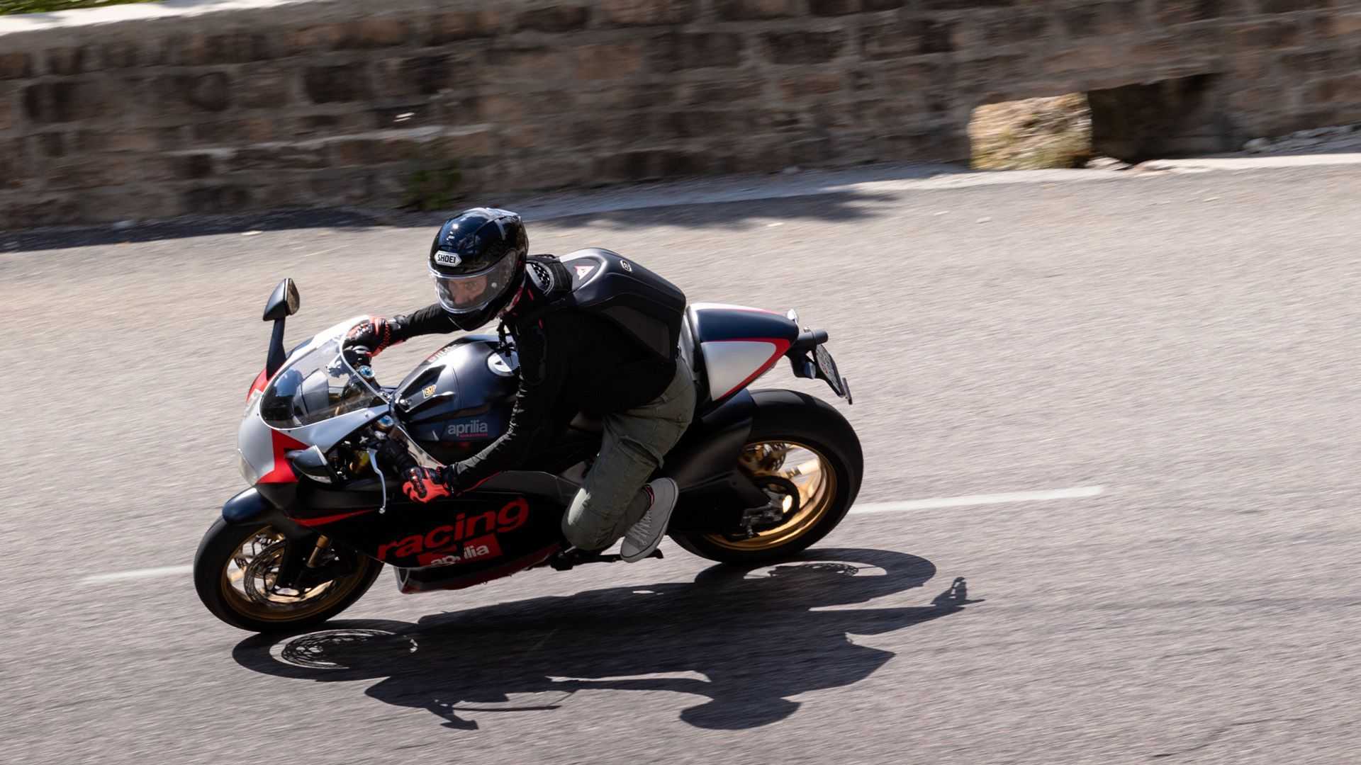 La RS250 a réutilisé un moteur bicylindre en V d’origine Suzuki RGV250 avec un calculateur modifié, des chambres d’expansion et une boîte à air spécifiques. Le bicylindre en V à 90 degrés de 249 cc à refroidissement liquide développait 65 chevaux mais ne faisait pencher la balance qu’à 140 kg. En comparaison, le RSV4 qui pèse un peu plus de 200kg développe 217 chevaux grâce à son moteur V4 de 1 099 cc à 65 degrés.