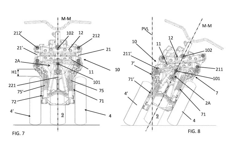 Sur le MP3, et la plupart des autres trois-roues inclinés, la suspension avant de chaque côté est maintenue par un mécanisme à parallélogramme au-dessus des roues. Celui-ci est composé de deux barres horizontales qui pivotent pour rester parallèles à la route tandis que le reste du véhicule s’incline. La demande de brevet de Piaggio suggère de monter le carénage avant sur ces barres plutôt que sur le châssis principal, de sorte qu’il reste également horizontal.