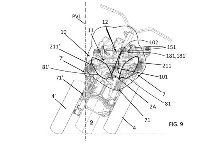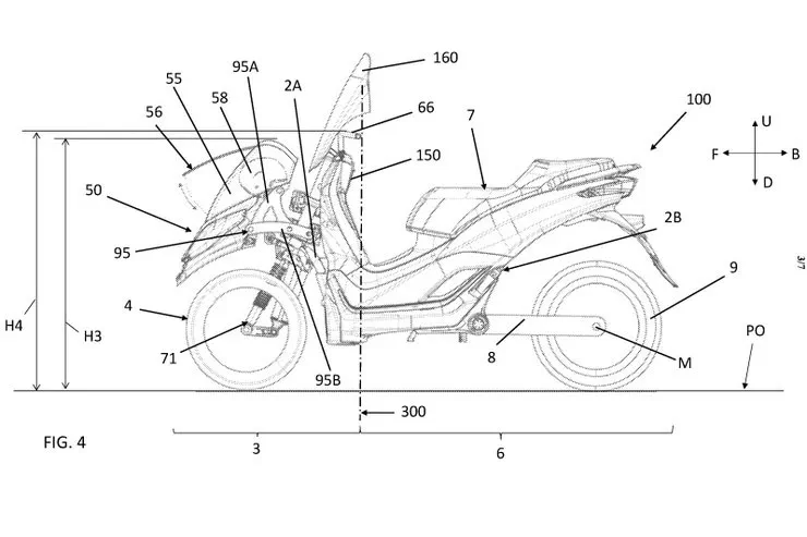 Le brevet de Piaggio suggère qu’une bulle haute peut toujours être montée sur le corps principal du véhicule pour protéger le pilote du vent et de la pluie. Il souligne également que cette face avant – désormais montée plus en avant qu’auparavant – peut devenir un espace de rangement utile. Le brevet montre une section en forme de capot qui peut être soulevée pour accéder à un espace de rangement au-dessus des phares suffisamment grand pour prendre un casque, ou même deux d’entre eux côte à côte.
