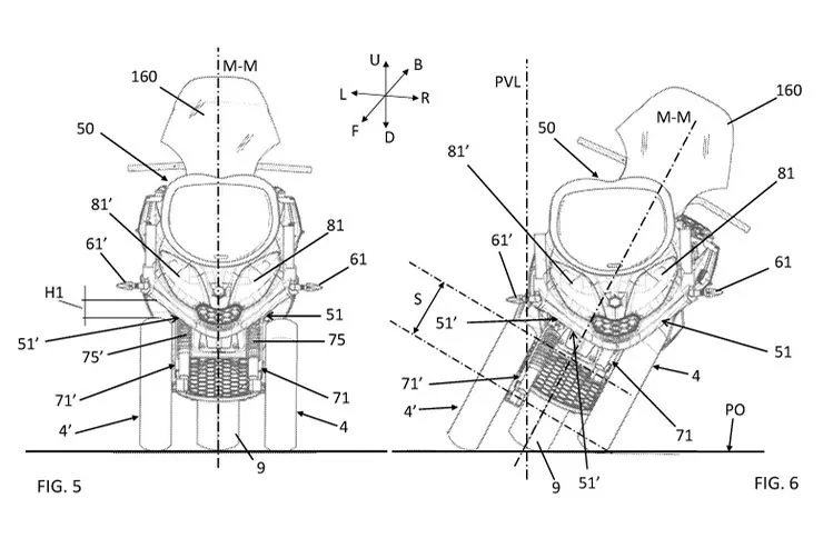 Sur le MP3, et la plupart des autres trois-roues inclinés, la suspension avant de chaque côté est maintenue par un mécanisme à parallélogramme au-dessus des roues. Celui-ci est composé de deux barres horizontales qui pivotent pour rester parallèles à la route tandis que le reste du véhicule s’incline. La demande de brevet de Piaggio suggère de monter le carénage avant sur ces barres plutôt que sur le châssis principal, de sorte qu’il reste également horizontal.
