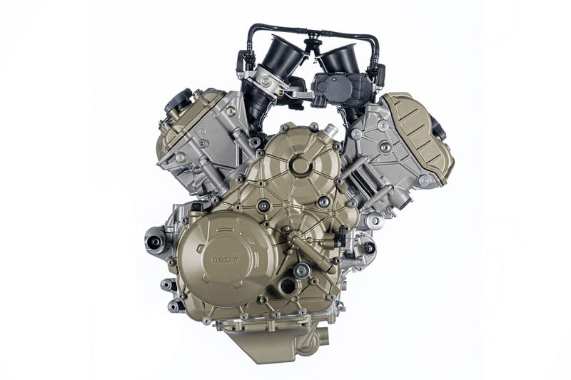 Avec son poids de 66,7 kg, le V4 Granturismo peut se targuer d’une légèreté record, puisqu’il est 1,2 kg plus léger que le bicylindre Testastretta utilisé sur la précédente Multistrada 1 260. La cylindrée de 1 158 cm3 s’est révélée être le point de jonction parfait en termes de performances, de légèreté et de dimension d’un moteur V4, capable d’être incroyablement léger et compact. Par rapport au moteur de la génération précédente, le V4 Granturismo est 85 mm plus court, 95 mm plus bas et seulement 20 mm plus large. Cette disposition compacte a permis aux ingénieurs de Ducati de loger le moteur dans le cadre de manière plus efficace et plus centrale afin d’influencer positivement la position du centre de gravité de la moto, avec tous les avantages qui en découlent.