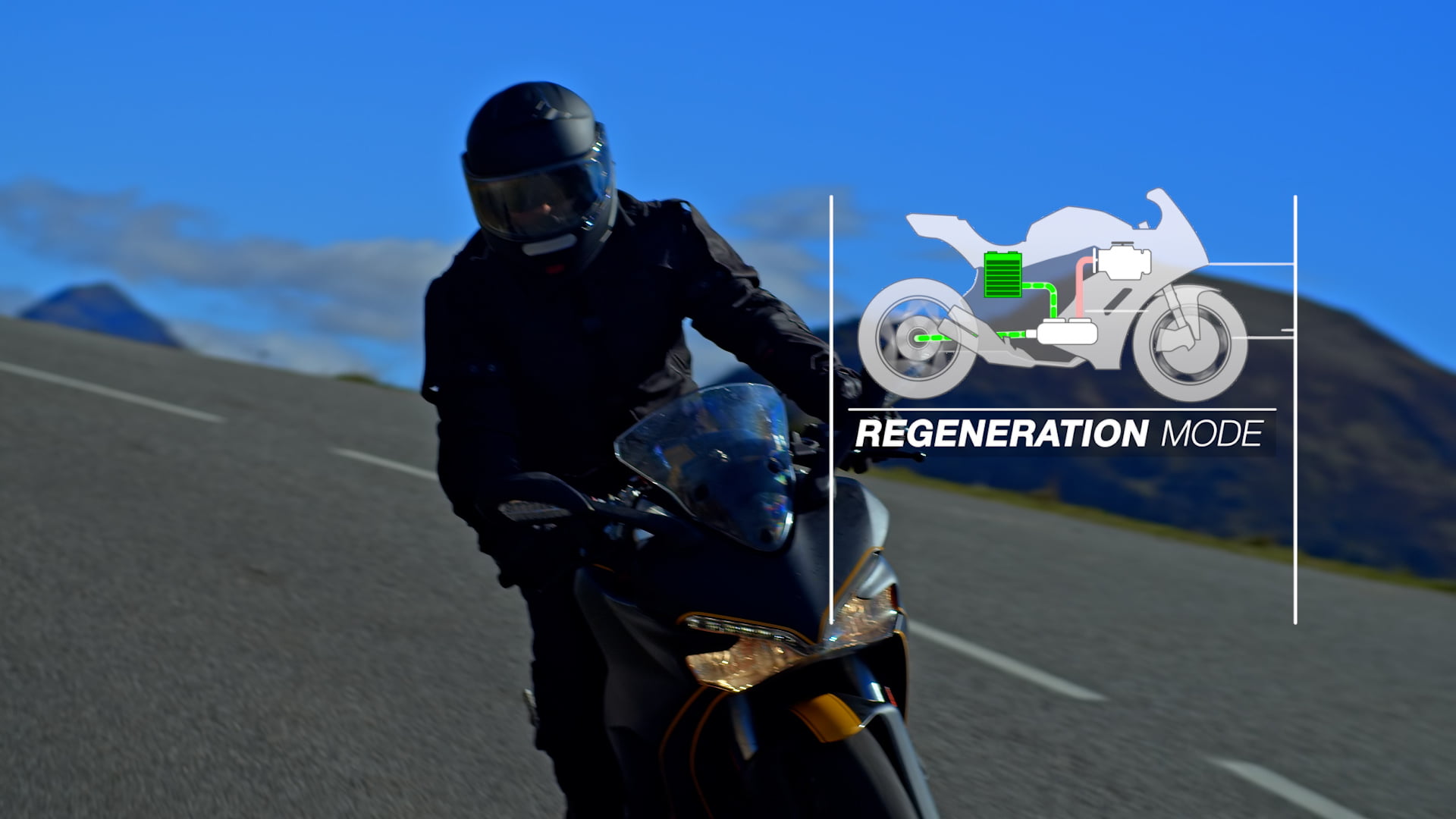 La fonction générateur du moteur électrique, utilisée pour charger la batterie, peut être utilisée comme frein moteur supplémentaire afin que le frein arrière mécanique ne soit nécessaire que si le motard doit décélérer brusquement.