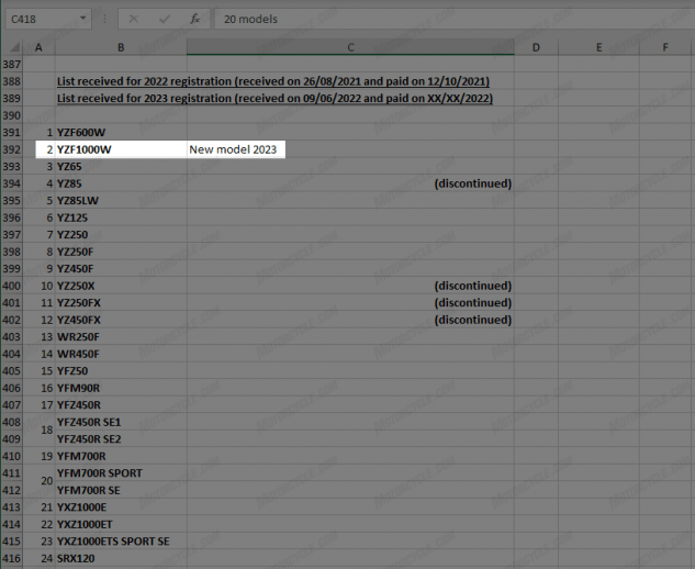 Et c’est là que cette liste est intéressante. En effet, bien que nous sachions que YZF1000 est le nom de code interne de la R1, la lettre suffixe désigne le modèle individuel (par exemple, YZF1000D est la R1M) et « W » fait référence au modèle dédié à la course, de la même manière que la Yamaha R6 RACE (YZF600W).