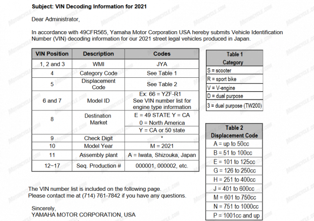 Le code concernant le châssis fournit quelques informations et plus grâce au code VIN qui apparaît dans les homologations américaines. Ainsi, le code JYACN07C indique la production au Japon (première et trois lettres), la lettre « C », commune aux modèles cross Yamaha, suggérerait un modèle de course, « N » correspond au quatre cylindres de 998 cc.