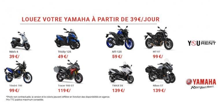 Que l’on soit à la recherche d’un deux ou trois roues pour le plaisir de rouler lors d’un week-end moto entre amis ou à la recherche d’un moyen de locomotion rapide et pratique lors de déplacements urbains, Yamaha Rent est une solution idéale.