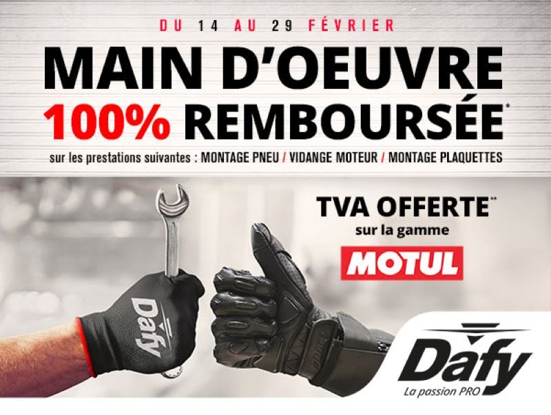 Montage et équilibrage de pneumatiques, vidange moteur, montages de plaquettes, les prestations dans les ateliers Dafy-Moto vous seront remboursées sous forme de bons cadeaux*. Jusqu’au 29 février prochain, les enseignes du groupe participant vous donnent un coup de pouce sur la main d’œuvre de votre révision.