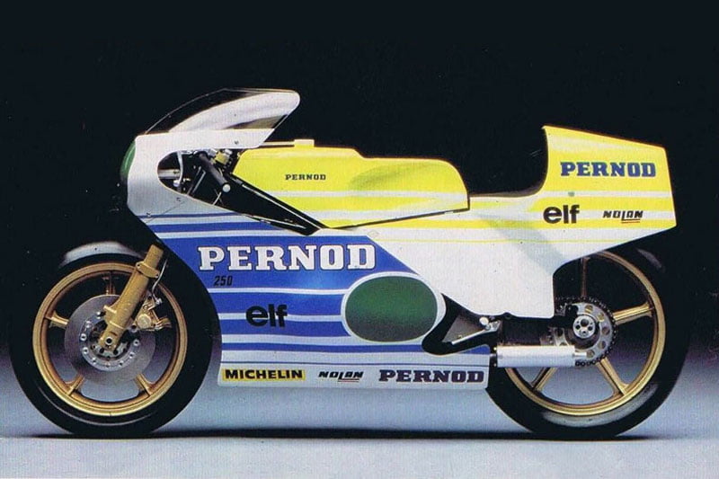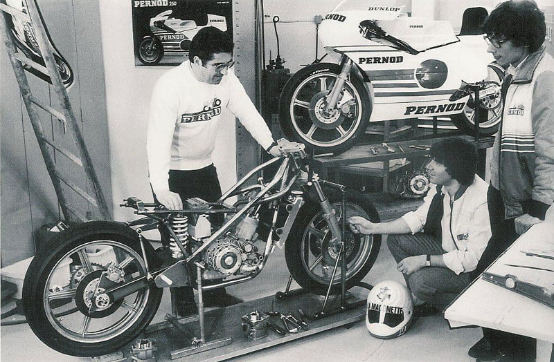 Le fougueux Guy Bertin s’impose en 125cc, triomphant à domicile sur une machine de l’hexagone. C’est la consécration ; immédiatement, Pernod revoit son engagement. La firme désire désormais une machine de course entièrement française, capable de jouer la victoire en 250cc. Dans un pays où le sport moto n’est pas une priorité, le pari semble osé. Bidalot, pierre angulaire du projet Motobécane, est recruté pour dessiner l’arme future.