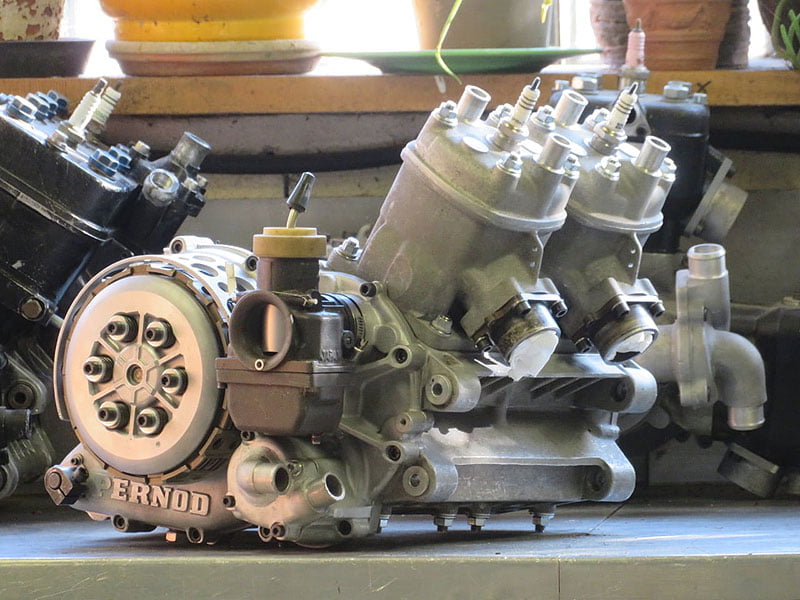 Bicylindre deux temps face à la route, à cylindres et culasses indépendants en alliage d’aluminium, incliné de 35° vers l’avant.