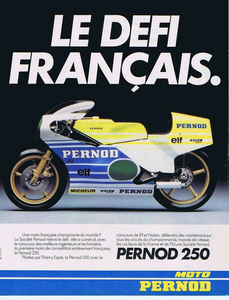 Malgré une fin étrange au goût amer, l’aventure Pernod est définitivement ancrée dans l’histoire du sport motocycliste français. Une victoire 100 % française sur le sol anglais accompagnée d’une campagne de pub massive n’auront pas manqué de marquer les esprits des rêveurs.