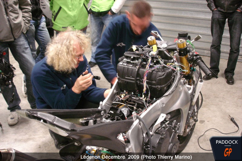 Il n’y avait pas de constructeurs qui avaient déjà fait des motos, et c’est pour ça qu’on s’est retrouvé la première année avec 13 constructeurs pour une trentaine de pilotes. Un peu tout le monde avait fait son truc puisque personne n’avait l’avantage. Donc là, il a fallu se bouger le cul, surtout qu’on faisait ça à temps perdu avec l’équipe MotoGP. Heureusement, cette année-là, il n’y avait pas d’essais le vendredi matin : il n’y avait que trois séances et pas d’essais le vendredi matin, donc quand on était sur place, tous les vendredis matin on travaillait le concept sur l’ordinateur. En tout cas, les délais ont été tenus et on a roulé dernière semaine de novembre/première semaine de décembre. »