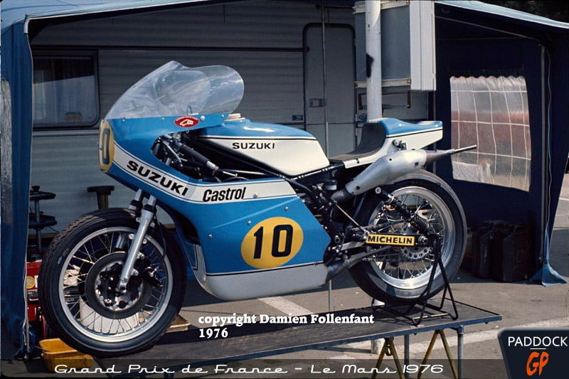 Révolutionnaire avec son 4 cylindres 2 temps en carré, mythique compagne de la carrière du gigantesque Barry Sheene, la Suzuki 500 RG a accompagné tous les pilotes de la catégorie 500 dans les années 75 / 80 en représentant parfois la totalité du plateau des GP 500.