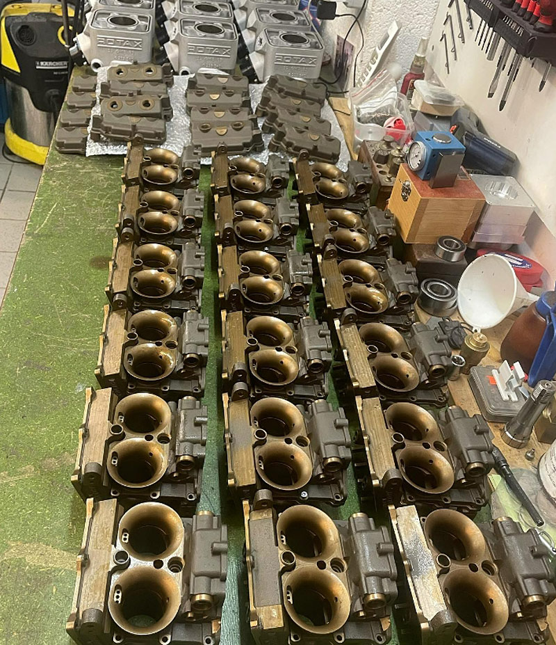 Claude Hauser : « Au départ, je suivais sur Facebook Carlo Mattarozzi qui avait fait entre autre six répliques de Morbidelli, 250 bicylindres, 350 bicylindres, 350 quatre cylindres ainsi qu’une sorte de moteur Rotax avec les cylindres un peu plus inclinés. J’admirais donc son travail et en allant à Dijon, à Moto Légende, je vois une magnifique réplique de Morbidelli. Effectivement, c’était bien une de ses motos et on a commencé à discuter. J’ai évoqué le fait que je voulais refaire des cylindres pour Rotax, un peu améliorés mais avec le look de l’époque, et il m’a invité à venir à Bologne. On m’a donc prêté un cylindre d’Aprilia 2007 que j’ai tomographié pour avoir la forme des transferts. Ensuite, j’ai redessiné le cylindre puis fais les moules pour faire une série de cylindres avec la collaboration de Carlo Mattarozzi qui, lui, connaît bien tout un réseau de sous-traitants, que ce soit pour le sable, la fonderie et toutes ces choses. »