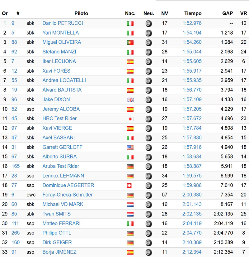L’après-midi était globalement du même acabit même si la pluie cessait par moment, et malgré quelques chutes sans gravité dont Yari Montella (Barni Spark Racing Team) et Danilo Petrucci, les chronos parvenaient quand même à s’améliorer peu à peu, jusqu’au 1’52.976 de Petrux, plus d’une seconde plus rapide que son ancien coéquipier chez Barni.