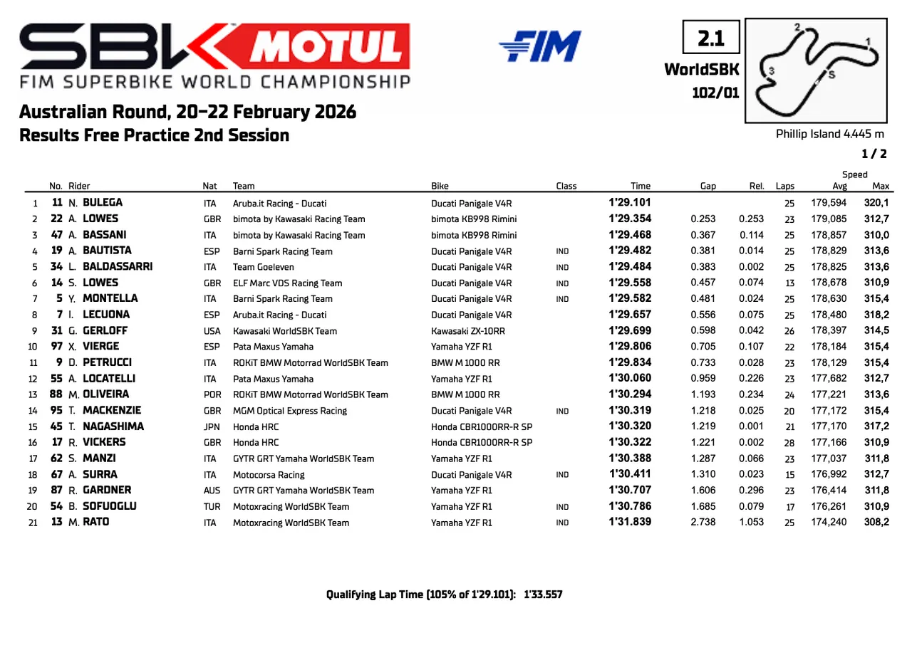 Superbike, Australie, FP2 : Bulega écrase les autres Ducati, Yamaha dans la tourmente