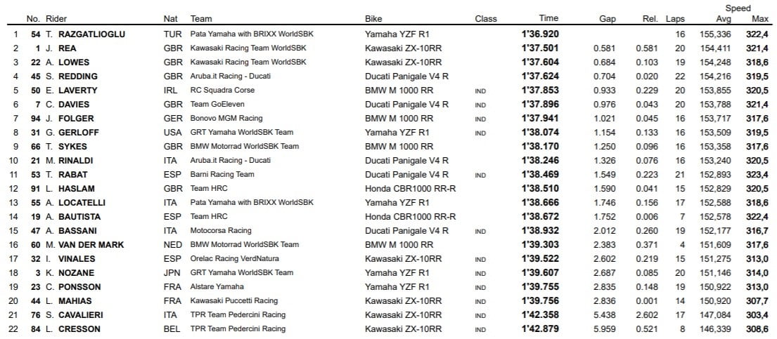 Chaz Davies, vainqueur de la Course 2 l’an passé, a pour sa part livré une séance studieuse et sans fioriture, avec le gain de la sixième position, devant Jonas Folger et Garrett Gerloff. Le top 10 est complété par Tom Sykes et Michael Ruben Rinaldi.