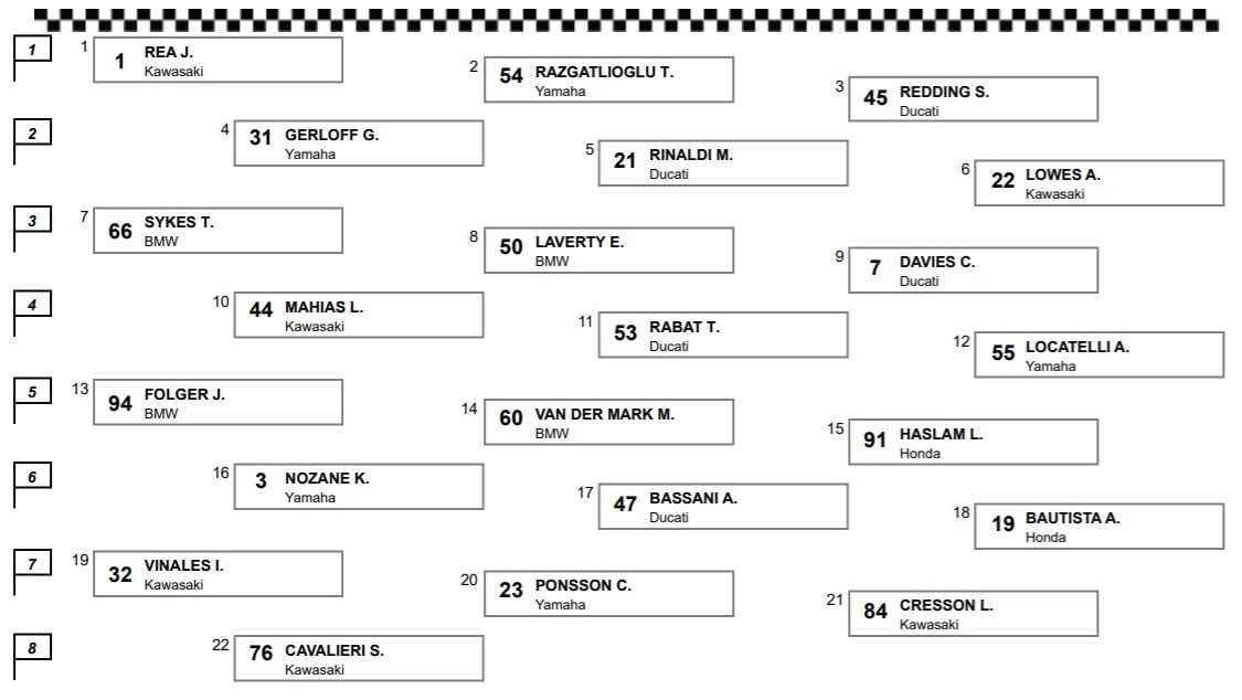 | Warm Up | 1’36.424 Toprak Razgatlioglu | 1’36.416 Jonathan Rea |